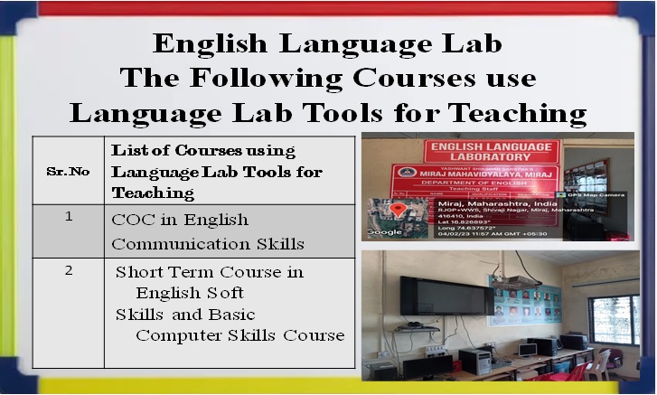 The Department of English Miraj Mahavidyalaya, Miraj offers a robust infrastructure for undergraduate students of the B.A., B.om. and B.Sc., Part I, II & III programme. The department Language Lab consists an area of 28.93 square meters, creating a conducive learning environment that fosters academic engagement. One of the prominent features of the department is its well-equipped Language Lab, which facilitates various tools and software specifically designed to enhance students' phonetic skills and correct pronunciation. There are 27 modules are set for students’ practice and its approach allows students to expand their vocabulary and practice the pronunciation of words, empowering them to communicate more effectively.